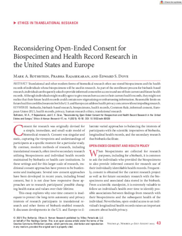 Rothstein, Mark A., Rajasekaran, Prabha and Dove, Edward (2025) Reconsidering Open‐Ended Consent for Biospecimen and Health Record Research in the United States and Europe. Ethics and Human Research, 47 (4). pp. 43-50. ISSN 2578-2363