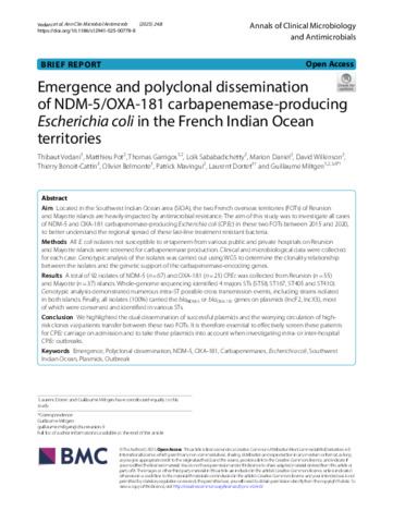 Vedani, Thibaut, Pot, Matthieu, Garrigos, Thomas, Sababadichetty, Loïk, Daniel, Marion, Wilkinson, David, Benoit-Cattin, Thierry, Belmonte, Olivier, Mavingui, Patrick, Dortet, Laurent and Miltgen, Guillaume (2025) Emergence and polyclonal dissemination of NDM-5/OXA-181 carbapenemase-producing Escherichia coli in the French Indian Ocean territories. Annals of Clinical Microbiology and Antimicrobials, 24 (1). ISSN 1476-0711
