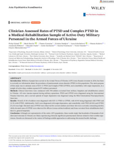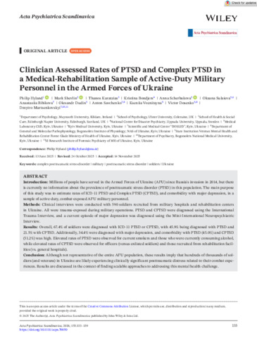 Hyland, Philip, Shevlin, Mark, Karatzias, Thanos, Bondjers, Kristina, Scherbakova, Anna, Sulaieva, Oksana, Bibikova, Anastasiia, Dudin, Olexandr, Savchenko, Anton, Voznitsyna, Kseniia, Dosenko, Victor and Martsenkovskyi, Dmytro (2026) Clinician Assessed Rates of PTSD and Complex PTSD in a Medical‐Rehabilitation Sample of Active‐Duty Military Personnel in the Armed Forces of Ukraine. Acta Psychiatrica Scandinavica, 153 (2). pp. 133-139. ISSN 0001-690X