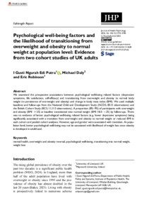 Putra, I Gusti Ngurah Edi, Daly, Michael and Robinson, Eric (2025) Psychological well-being factors and the likelihood of transitioning from overweight and obesity to normal weight at population level: Evidence from two cohort studies of UK adults. Journal of Health Psychology, 30 (13). pp. 3770-3785. ISSN 1359-1053