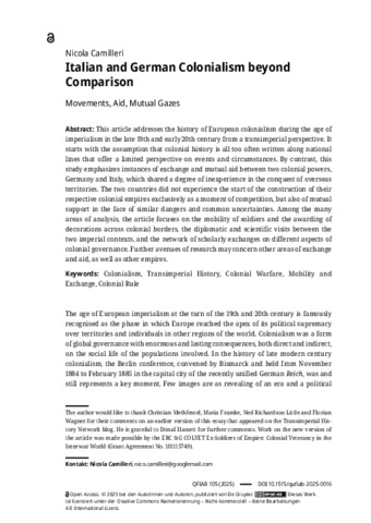 Camilleri, Nicola (2025) Italian and German Colonialism beyond Comparison: Movements, Aid, Mutual Gazes. Quellen und Forschungen aus italienischen Archiven und Bibliotheken, 105 (1). pp. 356-375. ISSN 0079-9068