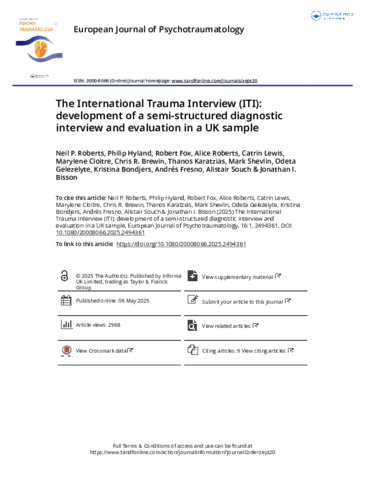 Roberts, Neil P., Hyland, Philip, Fox, Robert, Roberts, Alice, Lewis, Catrin, Cloitre, Marylene, Brewin, Chris R., Karatzias, Thanos, Shevlin, Mark, Gelezelyte, Odeta, Bondjers, Kristina, Fresno, Andrés, Souch, Alistair and Bisson, Jonathan I. (2025) The International Trauma Interview (ITI): development of a semi-structured diagnostic interview and evaluation in a UK sample. European Journal of Psychotraumatology, 16 (1). ISSN 2000-8066