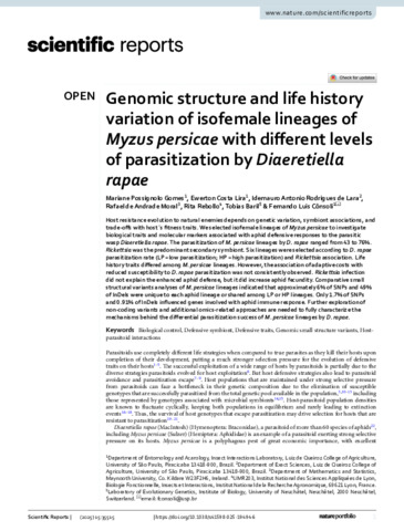 Gomes, Mariane Possignolo, Lira, Ewerton Costa, de Lara, Idemauro Antonio Rodrigues, de Andrade Moral, Rafael, Rebollo, Rita, Baril, Tobias and Cônsoli, Fernando Luis (2025) Genomic structure and life history variation of isofemale lineages of Myzus persicae with different levels of parasitization by Diaeretiella rapae. Scientific Reports, 15 (1). ISSN 2045-2322