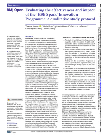 Kessie, Threase, Ryan, Linda, Howard, Michelle, Heffernan, Caitriona, Hyland Reilly, Laney and Gormly, Jared (2026) Evaluating the effectiveness and impact of the ‘HSE Spark’ Innovation Programme: a qualitative study protocol. BMJ Open, 16 (2). e109399. ISSN 2044-6055