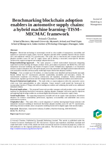 chauhan, Avinash (2026) Benchmarking blockchain adoption enablers in automotive supply chains: a hybrid machine learning–TISM– MICMAC framework. Journal of Modelling in Management. ISSN 1746-5672