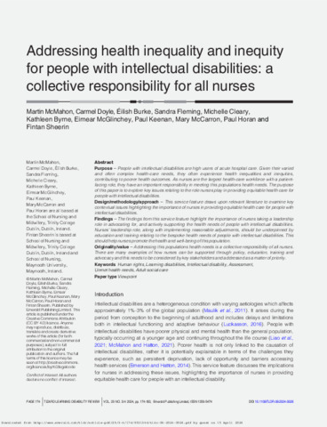 McMahon, Martin, Doyle, Carmel, Burke, Éilish, Fleming, Sandra, Cleary, Michelle, Byrne, Kathleen, McGlinchey, Eimear, Keenan, Paul, McCarron, Mary, Horan, Paul and Sheerin, Fintan (2024) Addressing health inequality and inequity for people with intellectual disabilities: a collective responsibility for all nurses. Tizard Learning Disability Review, 29 (3/4). pp. 174-183. ISSN 1359-5474