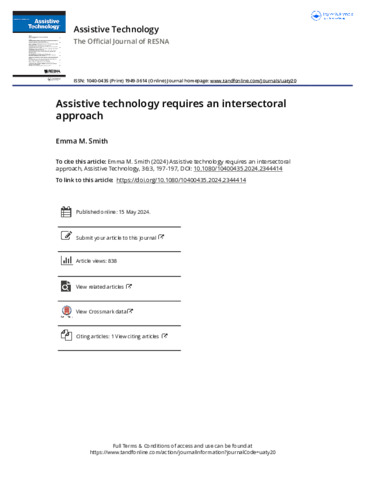 Smith, Emma M. (2024) Assistive technology requires an intersectoral approach. Assistive Technology, 36 (3). p. 197. ISSN 1040-0435