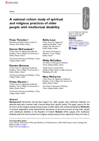 Timmins, Fiona, McCausland, Darren, Brennan, Damien, Sheerin, Fintan, Luus, Retha, McCallion, Philip and McCarron, Mary (2024) A national cohort study of spiritual and religious practices of older people with intellectual disability. Journal of Intellectual Disabilities, 28 (2). pp. 533-548. ISSN 1744-6295